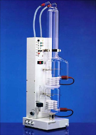 In the Bi 18 E components coming into contact witti water are quartz glass parts which, contrary to ordinary laboratory glass is non-hygroscopic and thus resistant to H20. These properties warrant the high purity requirements a distillate must fulfill.